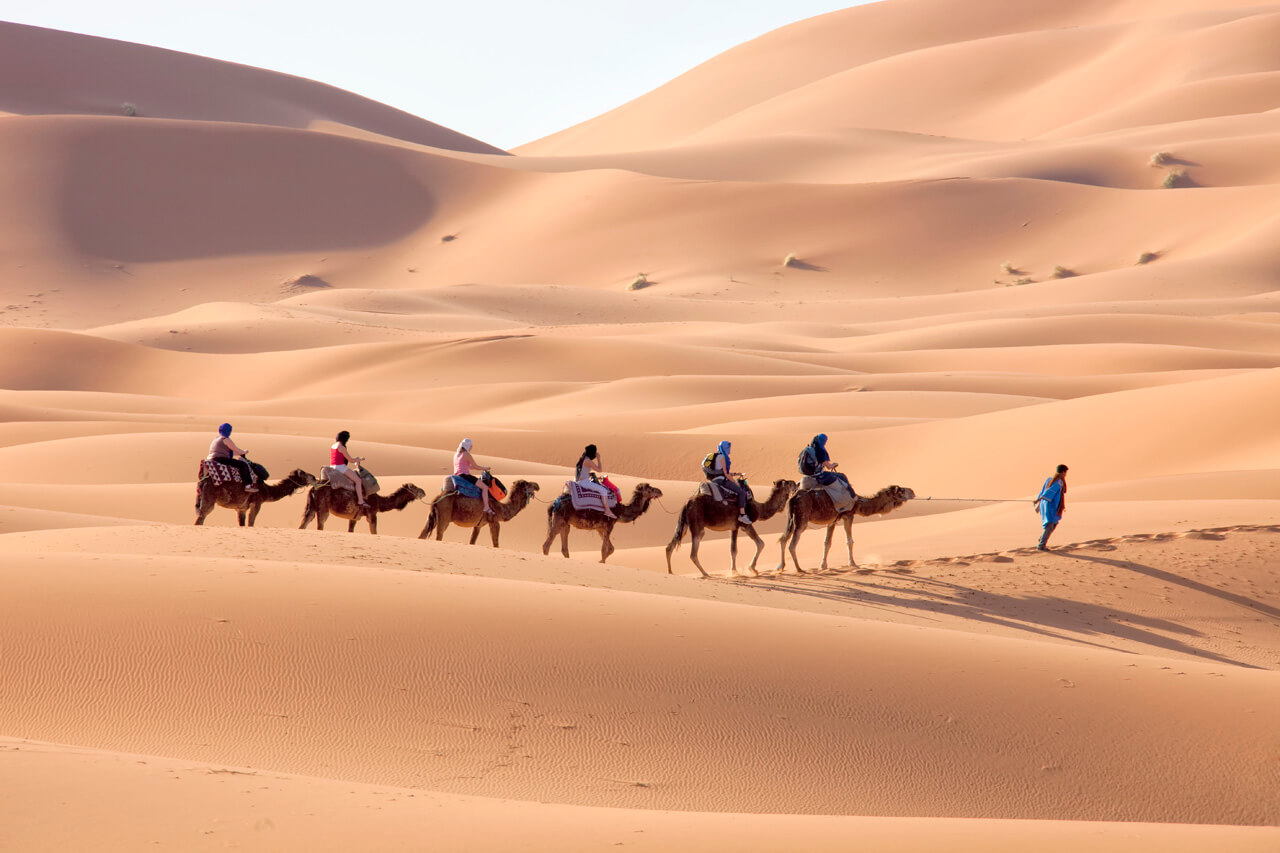 After breakfast we have a short drive to walk through a massive fault dividing the High Atlas mountains. Todra Gorge sheer rock walls rises to 300 m in its narrowest part. Then we’ll head for the Erg Chebbi sand sea. We continue deeper into the desert landscape, until dunes appear on the horizon. Our mid-afternoon destination is the auberge (small country inn) 29km from Merzouga, where you meet your camel guide and ride into the bivouac (camp). Upon arrival you will have a traditional tagine dinner prepared (vegetarians welcome) under the evening stars shining brilliantly in the clear night sky. Climb the dunes and watch the moon rise before retiring to your bed in a nomad tent.